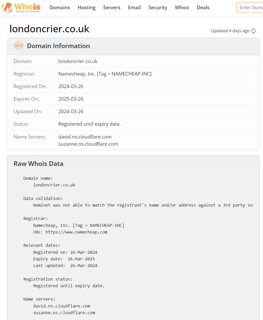 等待数秒后,返回以下页面。在这一页面内,我们可以了解到该网站的注册者为Namecheap公司(一家域名注册商和网络托管公司),注册时间在2024年3月26日,该时间距离网传说法发布的时间不足1周。