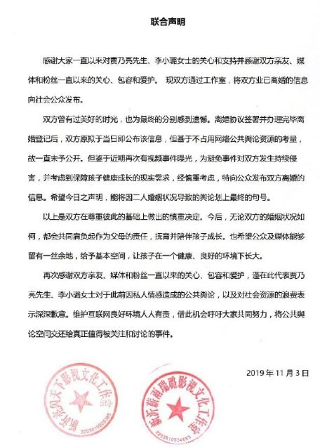 昨晚◆★◆■,@贾乃亮工作室 @李小璐工作室 同时发布联合声明宣布离婚。声明称,离婚协议签署并办理完离婚登记后★◆◆,双方原拟于当日即公布消息,但基于考量一直未予公开。为避免事件对双方持续性侵害和考虑到孩子的健康成长◆◆■■,经慎重考虑特向公众发布离婚信息,未来双方将肩负起责任抚育并陪伴孩子成长★◆。